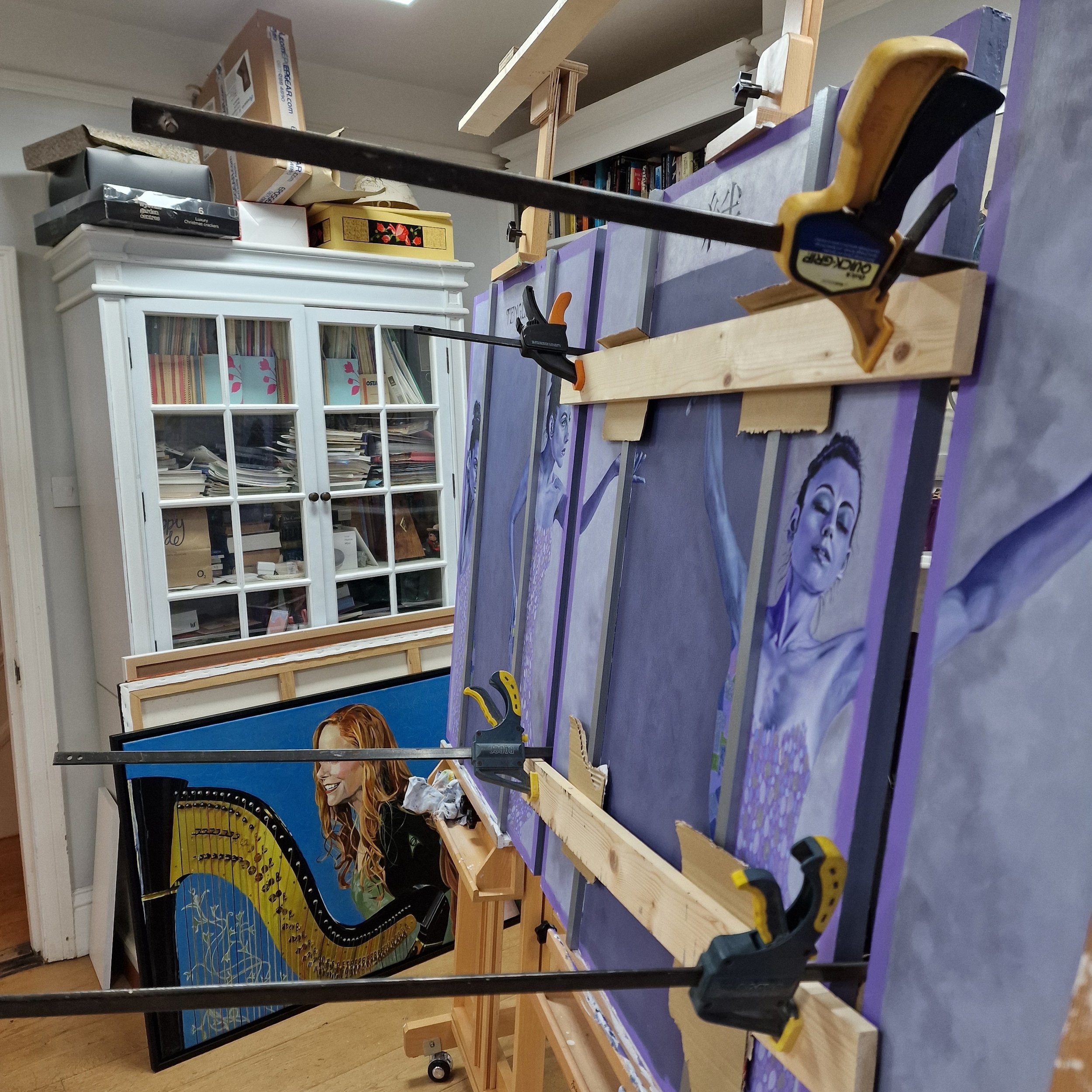 This Triptych is the first in the series of four paintings on the subject of human connection. The paintings are a study in the style of Gustav Klimt and Louis Majorelle. The painting contains four figures which convey meaning with gestures through dance. Their bodies are intersected by black and silver beading which shows the connection within ourselves and the differing patterns show by how much. Each figure is named after a Greek Goddess.